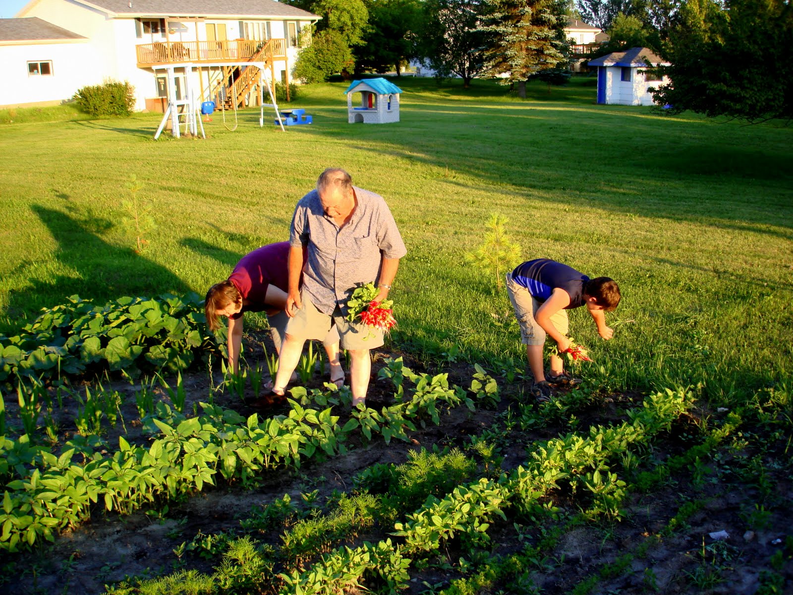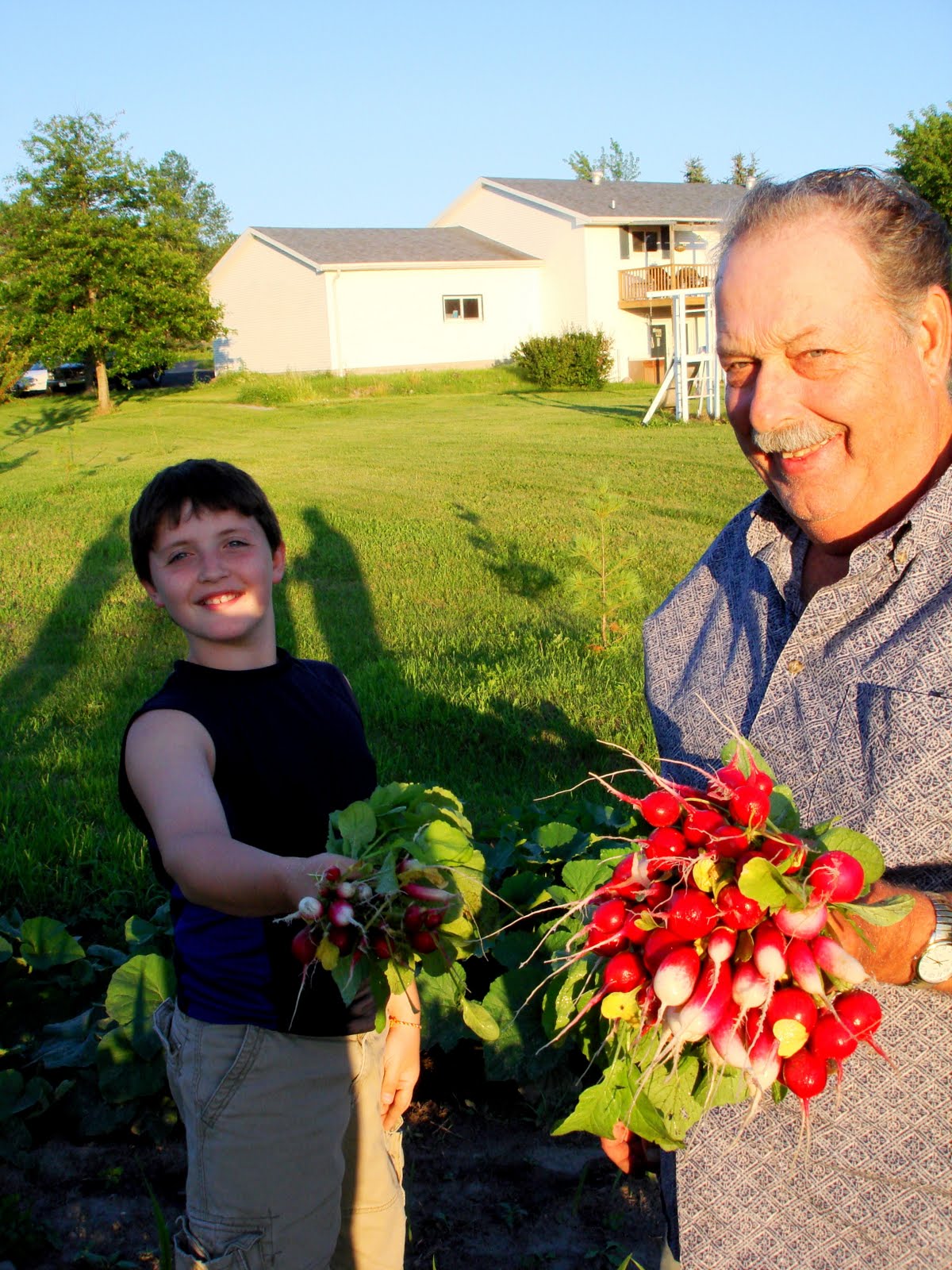 After picking the first crop of radishes I planted for my dad so he and Riley could enjoy them with a dab of butter (a delicacy my dad introduced him to a few months earlier), or as a radish sandwich, it was time for more watering, with my trusty boy manning the hose and the three of us watching his technique.