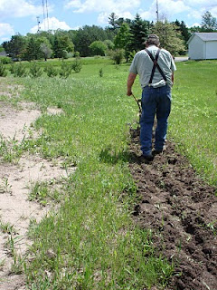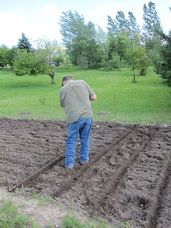 A few weeks later, after the weeds had died back, my dad came back to till it all over one more time. Because that's what you do. Then the marking of the rows commenced. In our family you don't just throw seeds in willy nilly. There are poles driven into the ground, and string, and tape measures. You need to leave enough room between the rows for walking and enough room for things to grow.