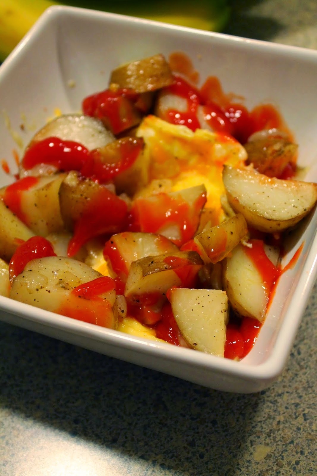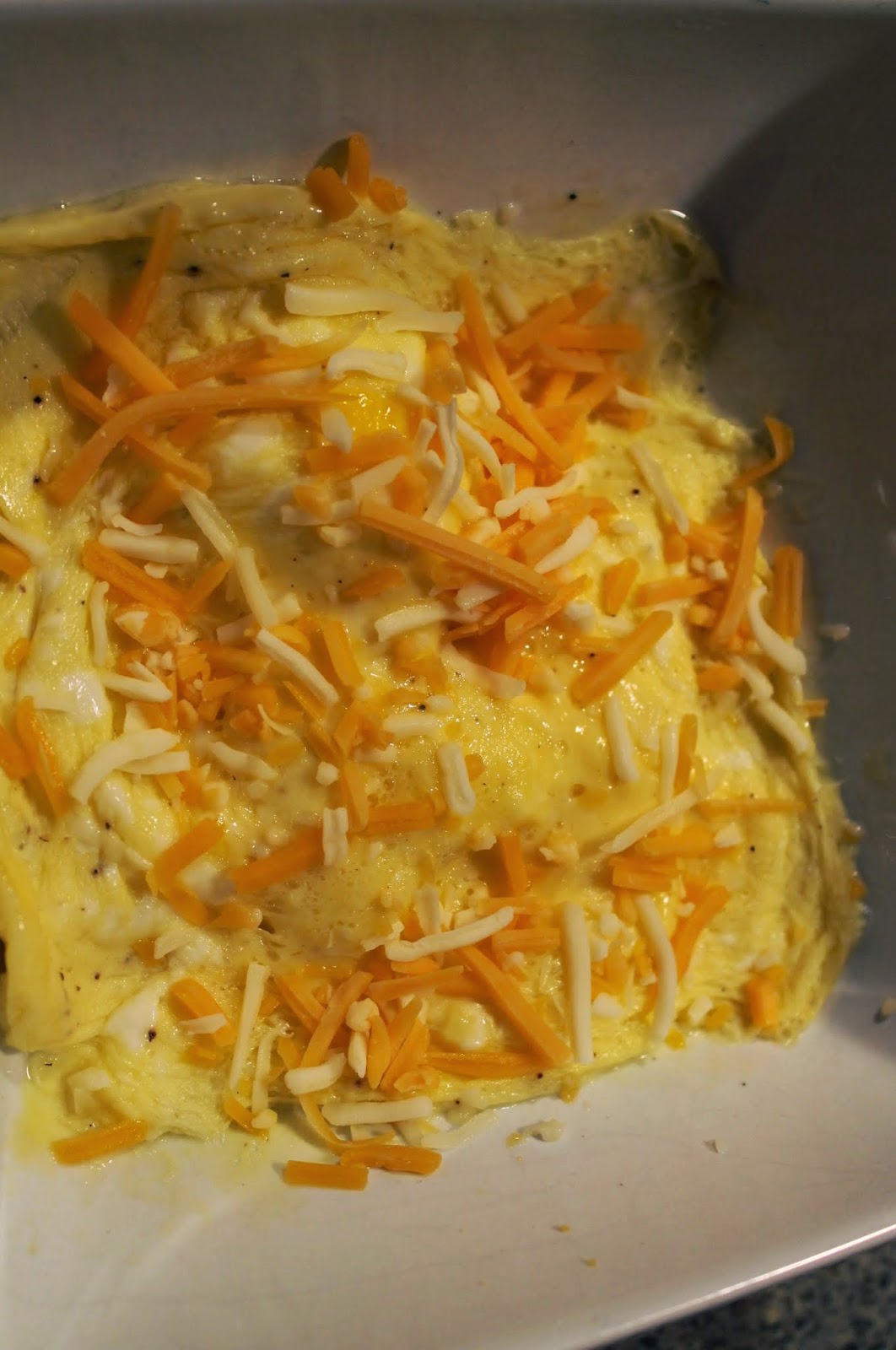 Top the eggs with the potatoes. Now is where it gets fun...you can added diced cooked bacon, ham, sausage, sauteed veggies, sliced green onions; anything you have in the fridge that you think would be yummy in your tummy.