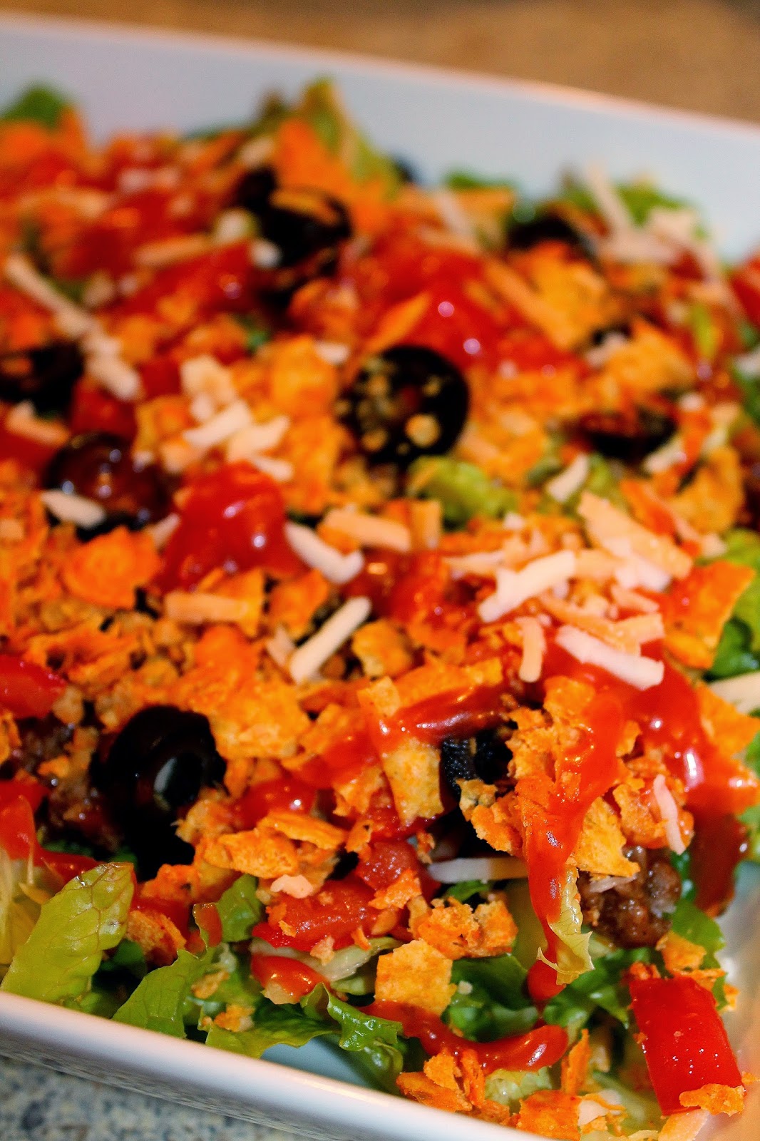 Fill a bowl with lettuce. Top it with the warm meat, then some shredded cheddar cheese to get it melting. Sprinkle on your choice of toppings; tomato, black olives, and green pepper. Crumble a handful or two of Doritos over the top of the salad. Drizzle with Western dressing, and or/Ranch dressing.