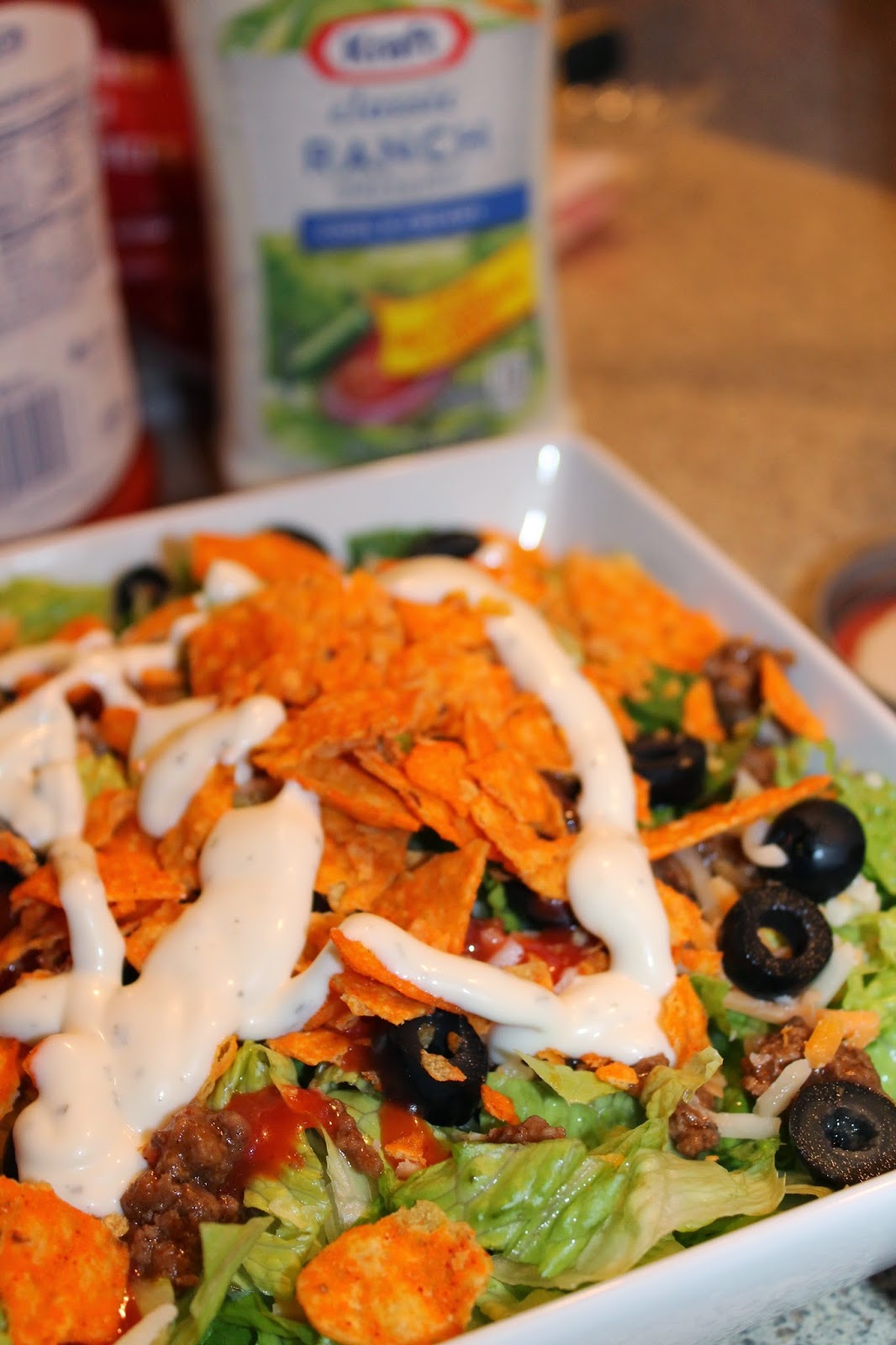 You can put all the individual ingredients for this salad out as a buffet and let each person make up their own. If you want to make one giant salad, toss all the salad ingredients and dressing together in a big bowl, leaving out the Doritos, and let each person crumble those over the top of their own serving.