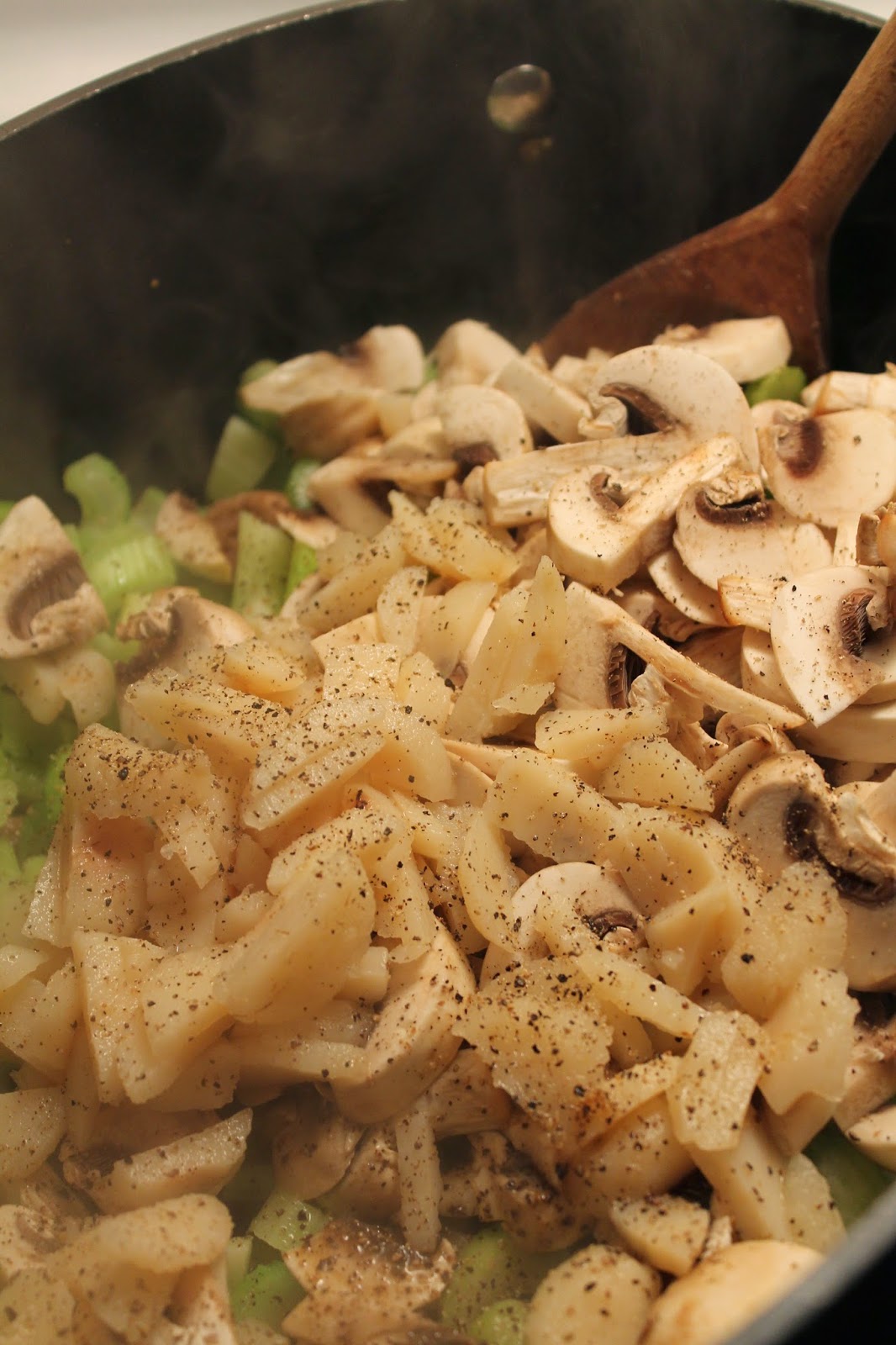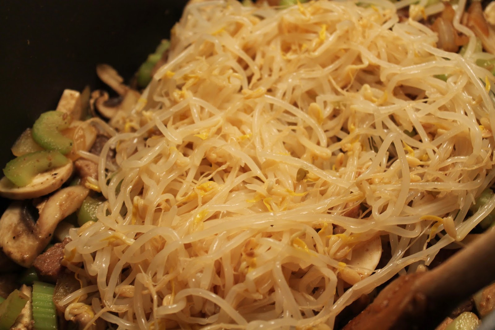 Add in the mushrooms, celery, bean sprouts, and water chestnuts. Add a bit more pepper if you like.