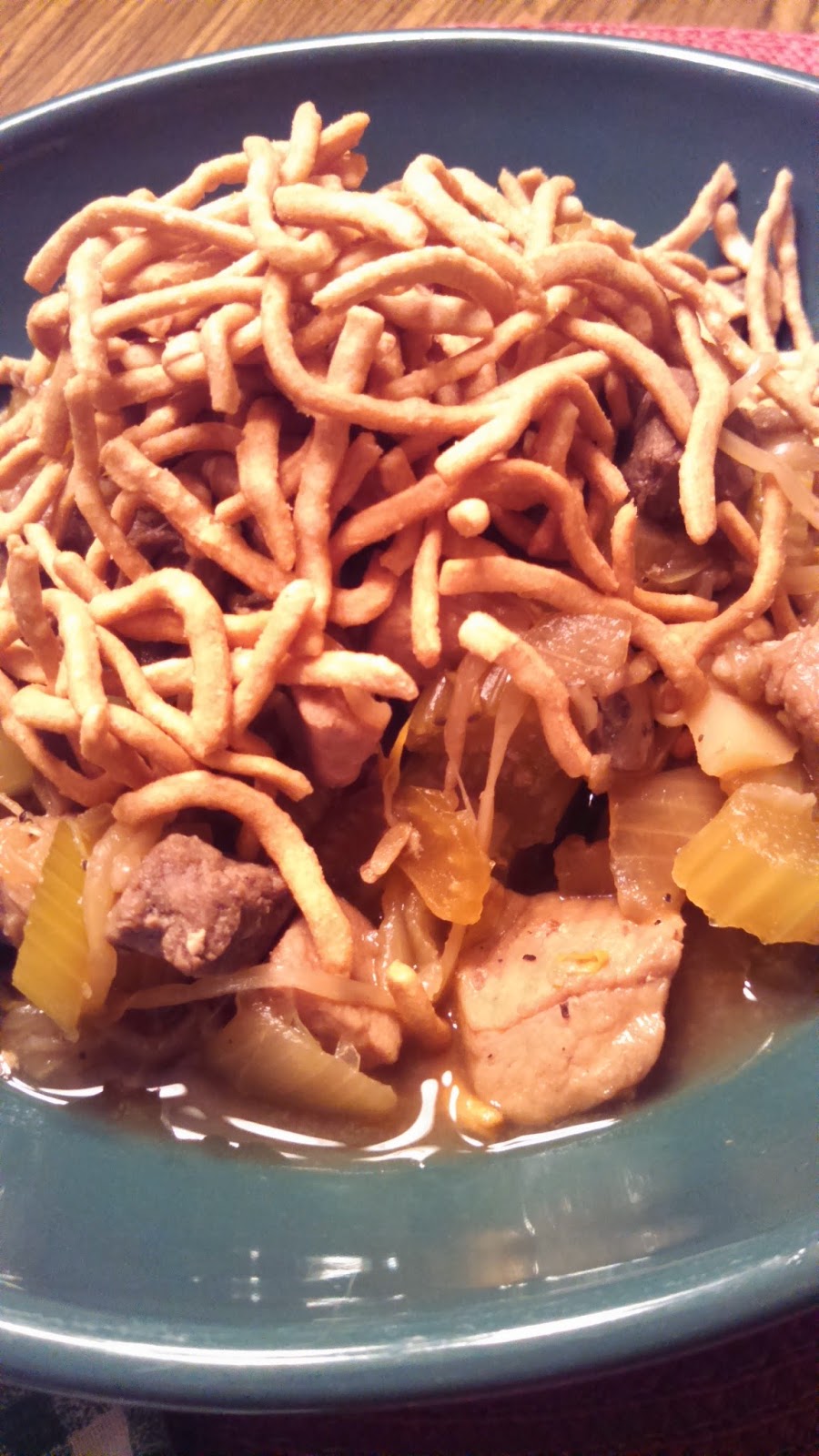 I call it "Minnesota Chow Mein", because it's not like any Chinese food you would buy at your local restaurant. I guess it's a lot like using the term "Tex-Mex"; it tastes like Chinese food, it looks like Chinese food, but uses less of the traditional ingredients you would find in a traditional Chinese recipe. I snuck in a few teaspoons of sesame oil when I made it this time, and it added a bit of modern flair that we really liked, but I'm sure that wasn't a pantry staple in Northern Minnesota when this recipe was created.