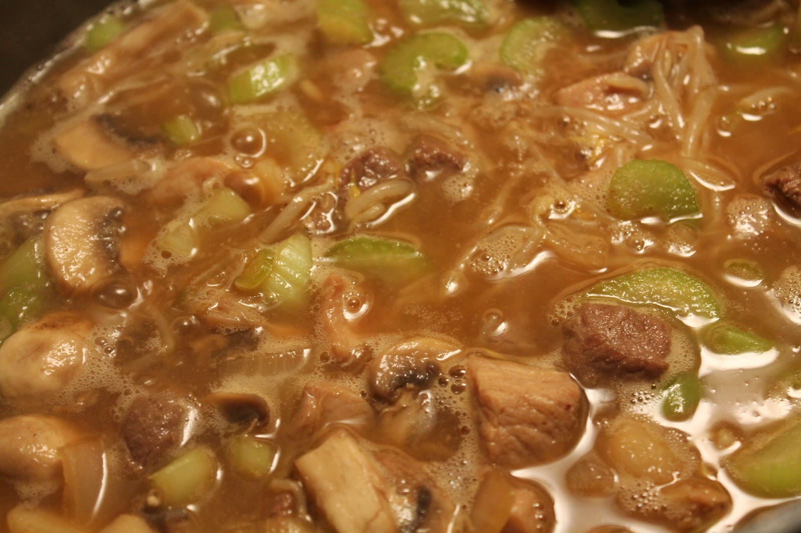 Add the oil to a large saucepan. Add the cubed meats, onion, soy sauce, and pepper and brown until the onions have softened.